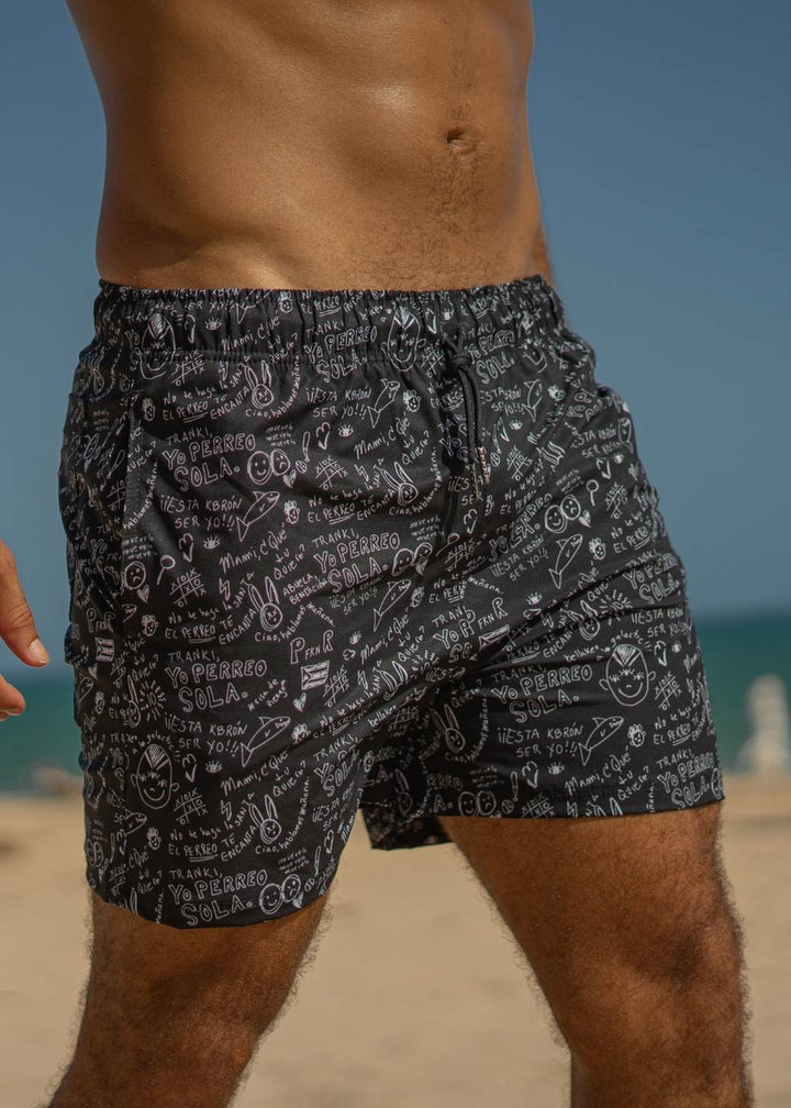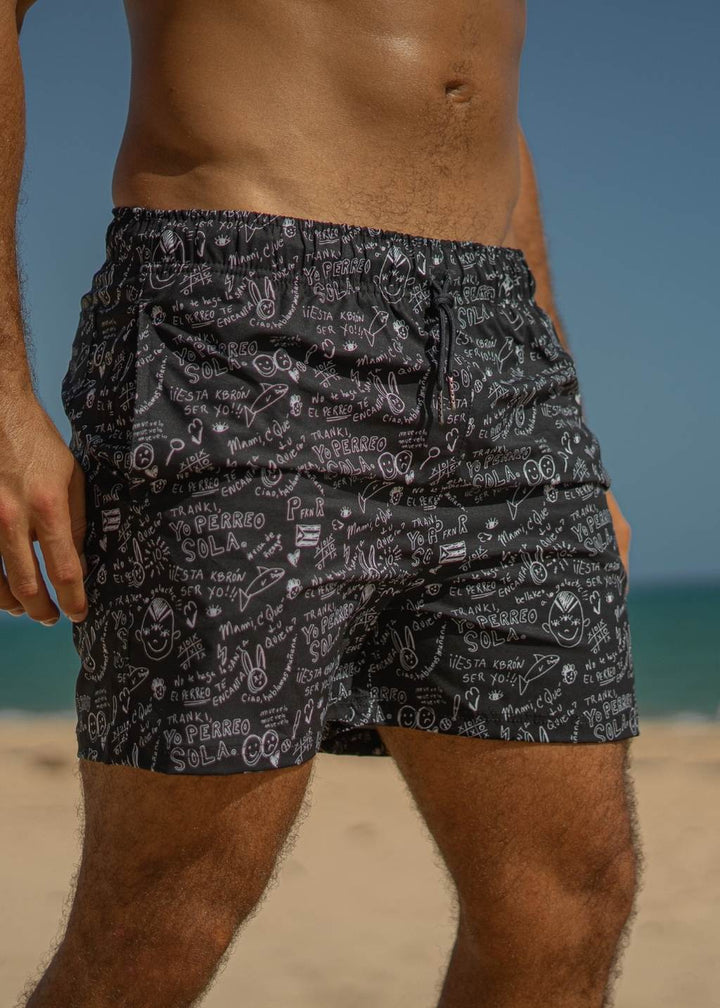 The embodiment of vibrant rhythm and playful style. Our Perreo Swim Short pays homage to the lively beats of Reggaeton and the most iconic symbols and phrases of this urban style, allowing you to showcase an energetic design. Capturing the perfect blend between music style and beachside comfort, designed to make a splash on and off the dance floor.